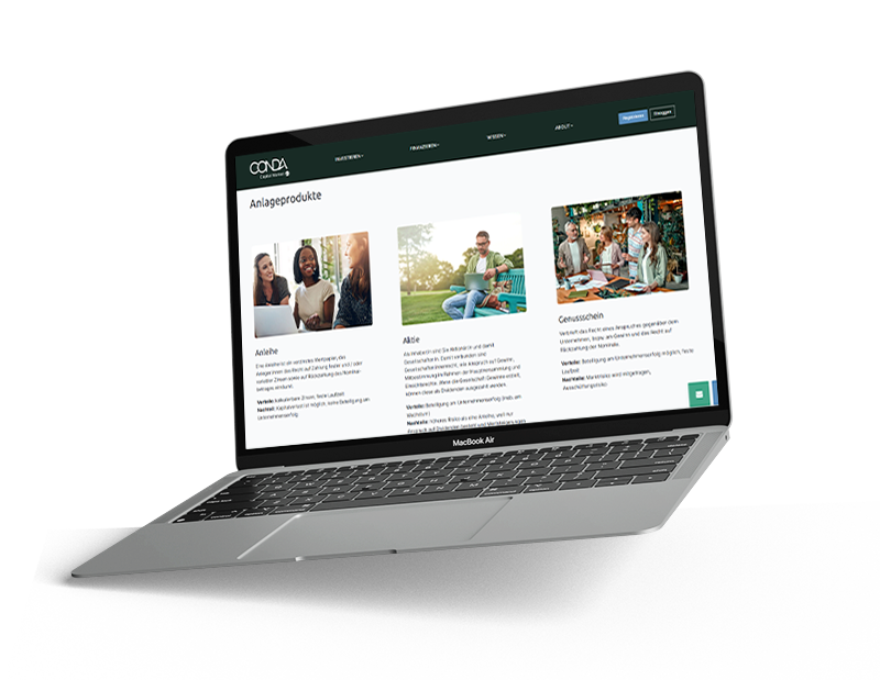 Auf CONDA Capital Market findest du verzinste Geldanlagen (Anleihen), Unternehmensbeteiligungen (Aktien, GmbH Anteile mittels SPV) sowie Mezzanine Geldanlagen (Genusscheine, nachrangige Anleihen sowie Wandelanleihen).